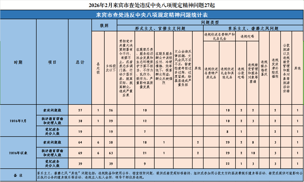 2026年2月来宾市查处违反中央八项规定精神问题27起