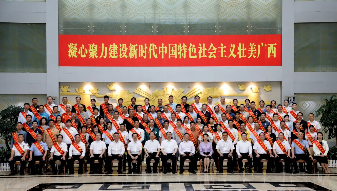 参会市领导与2025年来宾市先进单位代表、劳动模范和先进工作者合影。